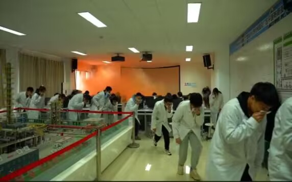 在逃生演练阶段,谭胜兵任总指挥,通过模拟虚拟仿真实验室电路老化起火开展火灾疏散演练。当浓烟弥漫,警报声响起之时,实验室任课老师立即发出疏散信号并拨打报警电话,同学们用湿巾等掩住口鼻,低头弯腰,在志愿者引导帮助下,沿逃生路线快速有序撤至安全地带。