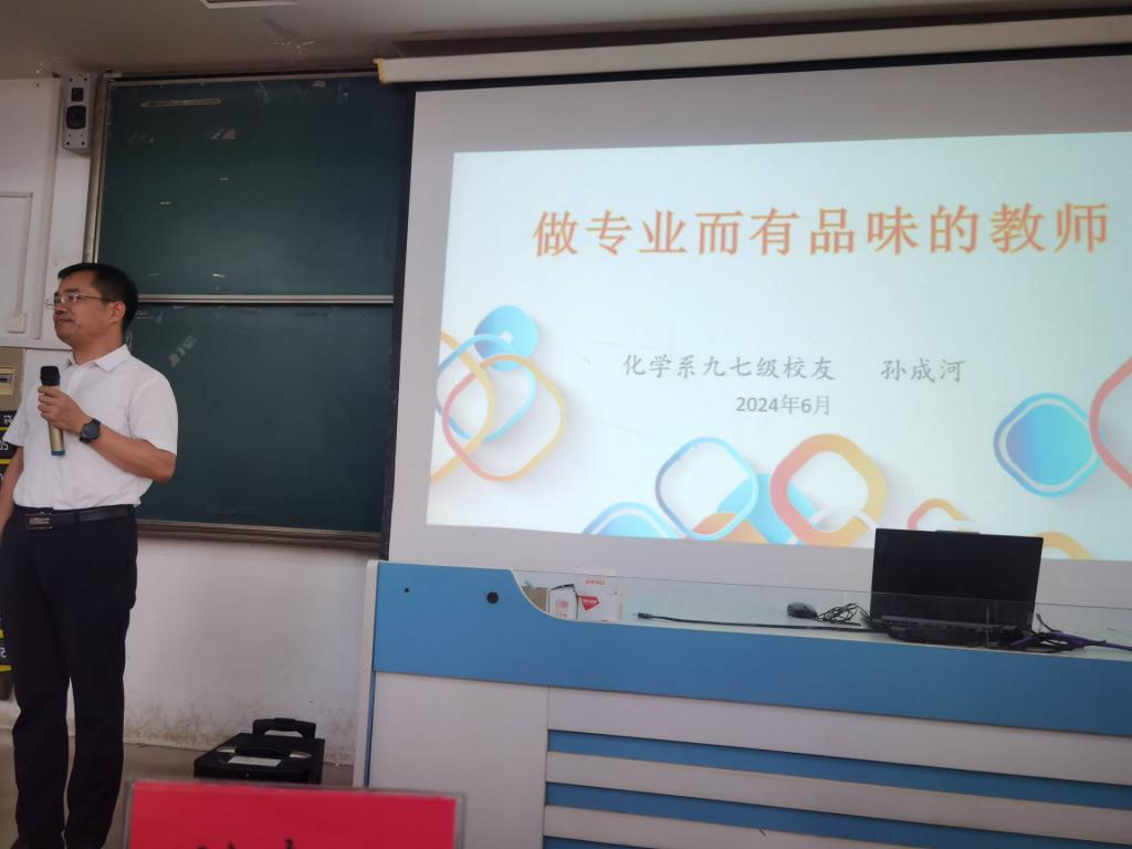 为提升师范生教师职业素养,促进教师专业成长,2024年6月5日下午,我院在综合楼1213举行教师教育报告会。学院邀请97级优秀校友,现任滕州市级索中学校长孙成河为化学专业全体师生做了一场“做专业而有品位的教师”专题报告,副院长马杰主持报告会。