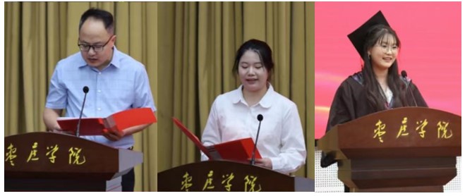 仪式在庄严的国歌声中拉开帷幕,全体起立,齐唱国歌,激昂的旋律回荡在现场。 副院长马杰宣读《2025届本科毕业生学士学位授予名单》。伴随着庄重而温馨的音乐,获得学士学位的同学依次上台,各位领导为他们一一拨穗正冠、颁发学士学位证书并合影留念。