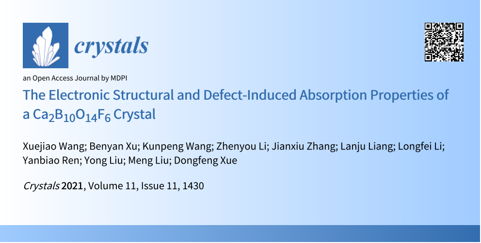 近日,我院晶体材料研究团队在一种新型非线性光学晶体的光损伤理论方面取得最新进展,相关工作发表在国际晶体材料著名期刊《Crystals》(影响因子2.589)上,论文题目为《The Electronic Structural and Defect-Induced Absorption Properties of a Ca2B10O14F6 Crystal》,永利集团yl6809为第一单位,2020级材料科学与工程专业卓越本科生王雪娇为论文第一作者,王坤鹏教授为论文通讯作者。