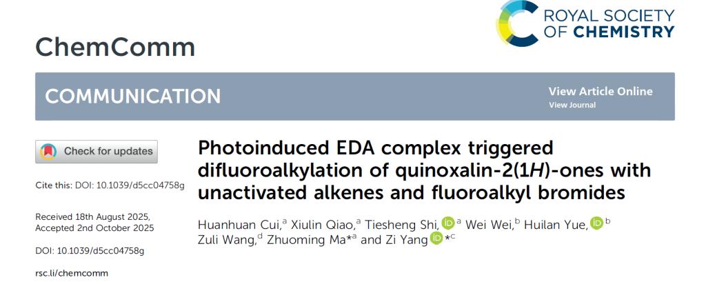 研究成果二:《Photoinduced EDA complex triggered difluoroalkylation of quinoxalin-2(1H)-ones with unactivated alkenes and fluoroalkyl bromides》。本研究开发了一种新颖、实用的光化学方法,用于合成C3-二氟烷基化的喹喔啉酮类化合物。其最大的亮点在于巧妙利用底物自身形成EDA复合物,完全规避了金属催化剂和外源光催化剂的使用,体现了绿色化学和步骤经济性的核心理念。这项工作不仅为含氟喹喔啉酮库的快速构建提供了强大工具,也为其在药物发现和功能材料中的应用开辟了新的可能性。更重要的是,这种基于EDA复合物的催化模式为其他类型惰性化学键的活化与官能团化提供了新的思路和借鉴。崔环环博士为本论文第一作者,永利集团yl6809为第一完成单位。该研究得到山东省自然科学基金和永利集团yl6809博士基金等项目支持。