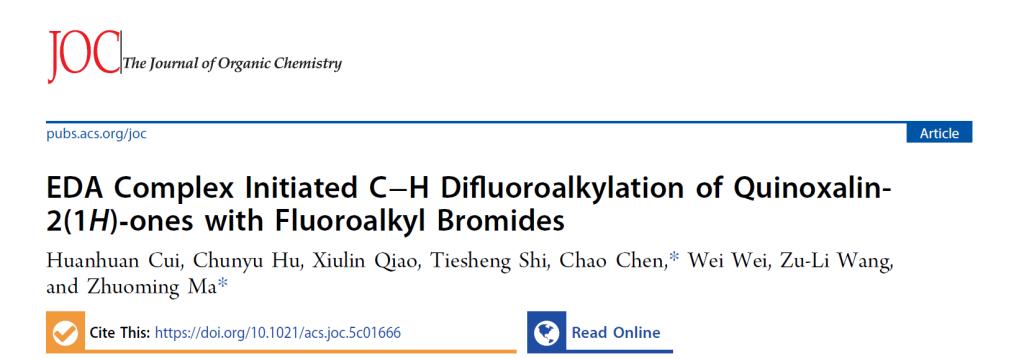 近日,我院“化学生物学创新团队”崔环环博士在光诱导EDA复合物——解锁喹喔啉酮绿色、高效二氟烷基化方面取得了重要的研究进展,相关研究成果发表于国际知名期刊《The Journal of Organic Chemistry》和《Chemical Communications》。