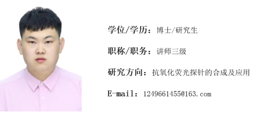 中共党员。2022年获中国人民大学有机化学专业博士学位,主要从事碳点类和BODIPY类有机小分子抗氧化荧光探针的合成、应用及反应机理等相关基础研究工作,尤其是通过光谱等手段对抗氧化荧光探针的抗氧化反应机理进行研究。主讲《化工仿真实训》、《化工过程模拟计算》、《化工热力学》等课程。作为成员参与国家自然科学基金面上项目“类黄酮-类胡萝卜素醛二联体合成及其抗氧化机理和膜探针性质研究”(项目编号:21673289)。在Sensors & Actuators B Chemical、Frontiers in Chemistry等期刊发表SCI收录的学术论文6篇,获取授权发明专利1件,参加国际会议2次。指导2023届本科毕业生6名。