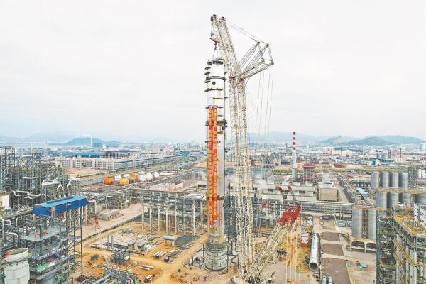 21日,在福清江阴中景石化科技园,全球最大的丙烷丙烯分离塔在中景石化二期年产100万吨丙烷脱氢项目工地完成吊装(如上图)。作为项目最核心的设备,该塔高度138米、容积11000立方米,是目前世界上最高、最大的丙烷丙烯分离塔。